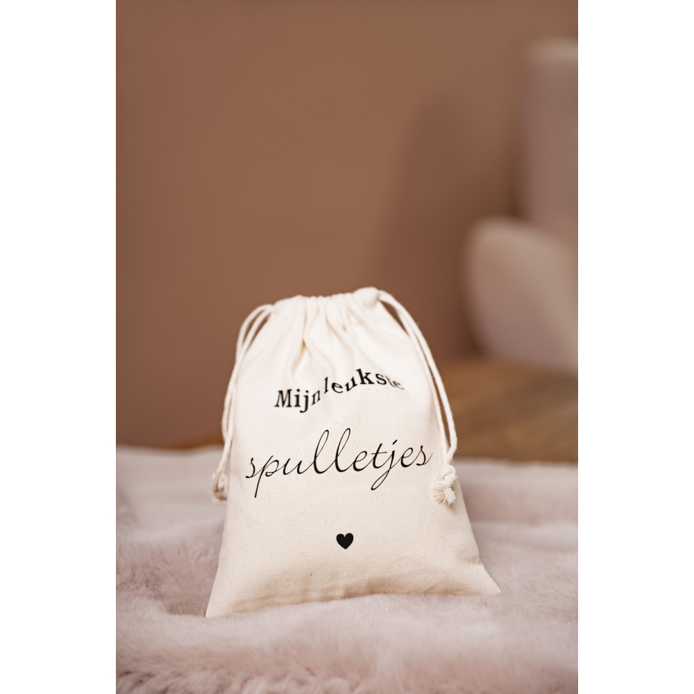 Houd je favoriete items veilig en stijlvol met ons veelzijdige bewaarkzakje, bedrukt met de tekst "Mijn Leukste Spulletjes". Dit charmante zakje is perfect voor het opbergen van alles wat je dierbaar is, van kostbare herinneringen en kleine schatten tot kunstwerken en speciale vondsten. Gemaakt van duurzaam materiaal met een vrolijk ontwerp, biedt het zakje een praktische en georganiseerde manier om je meest geliefde spulletjes netjes bij elkaar te houden. Of je nu een persoonlijke opslagoplossing zoekt of een uniek cadeau voor iemand speciaal, dit bewaarkzakje voegt een persoonlijke en speelse touch toe aan elke ruimte.