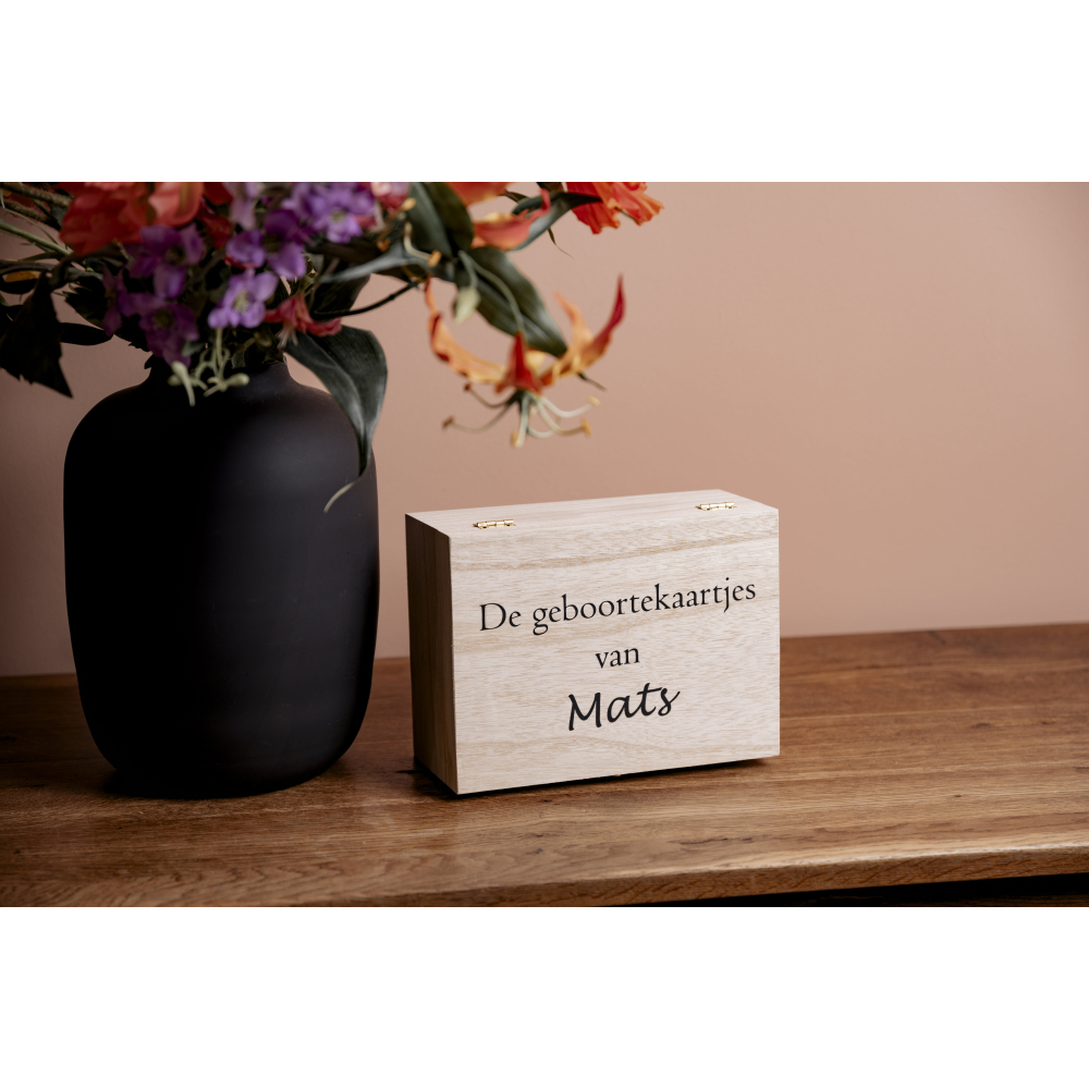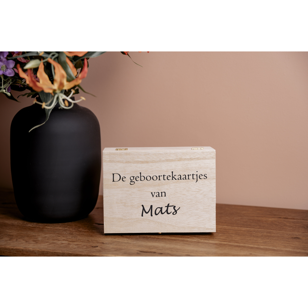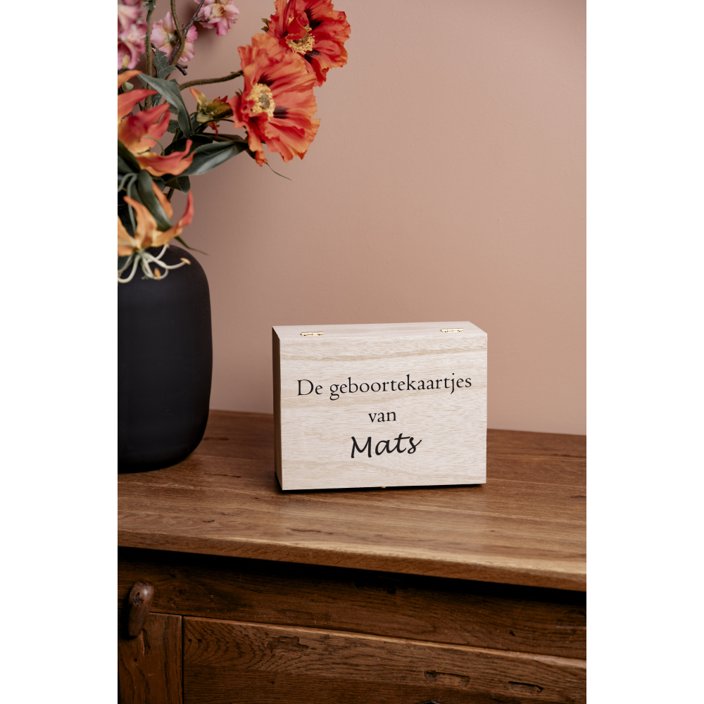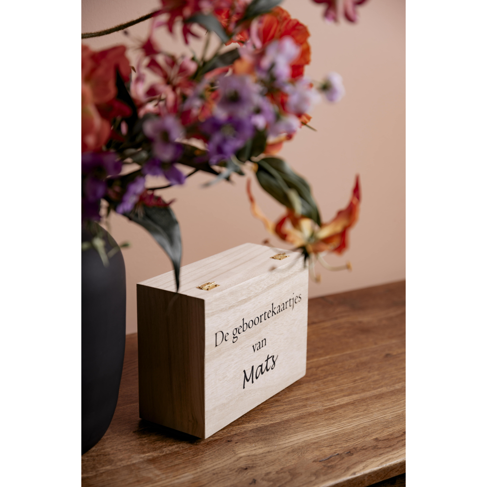 Bewaar de mooiste herinneringen van de geboorte van je kleintje op een stijlvolle en veilige manier met onze luxe houten geboortekaartjeskist. Deze prachtige kist, gemaakt van hoogwaardig hout, biedt een tijdloze en elegante manier om geboortekaartjes en andere kostbare herinneringen te koesteren. Met zijn verfijnde afwerking en duurzame constructie is deze kist niet alleen praktisch, maar ook een waardevolle toevoeging aan je interieur.