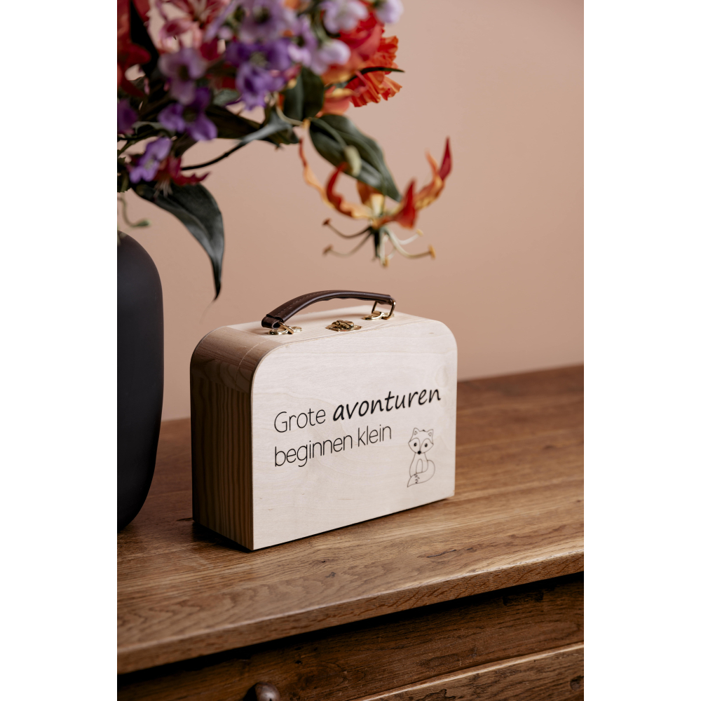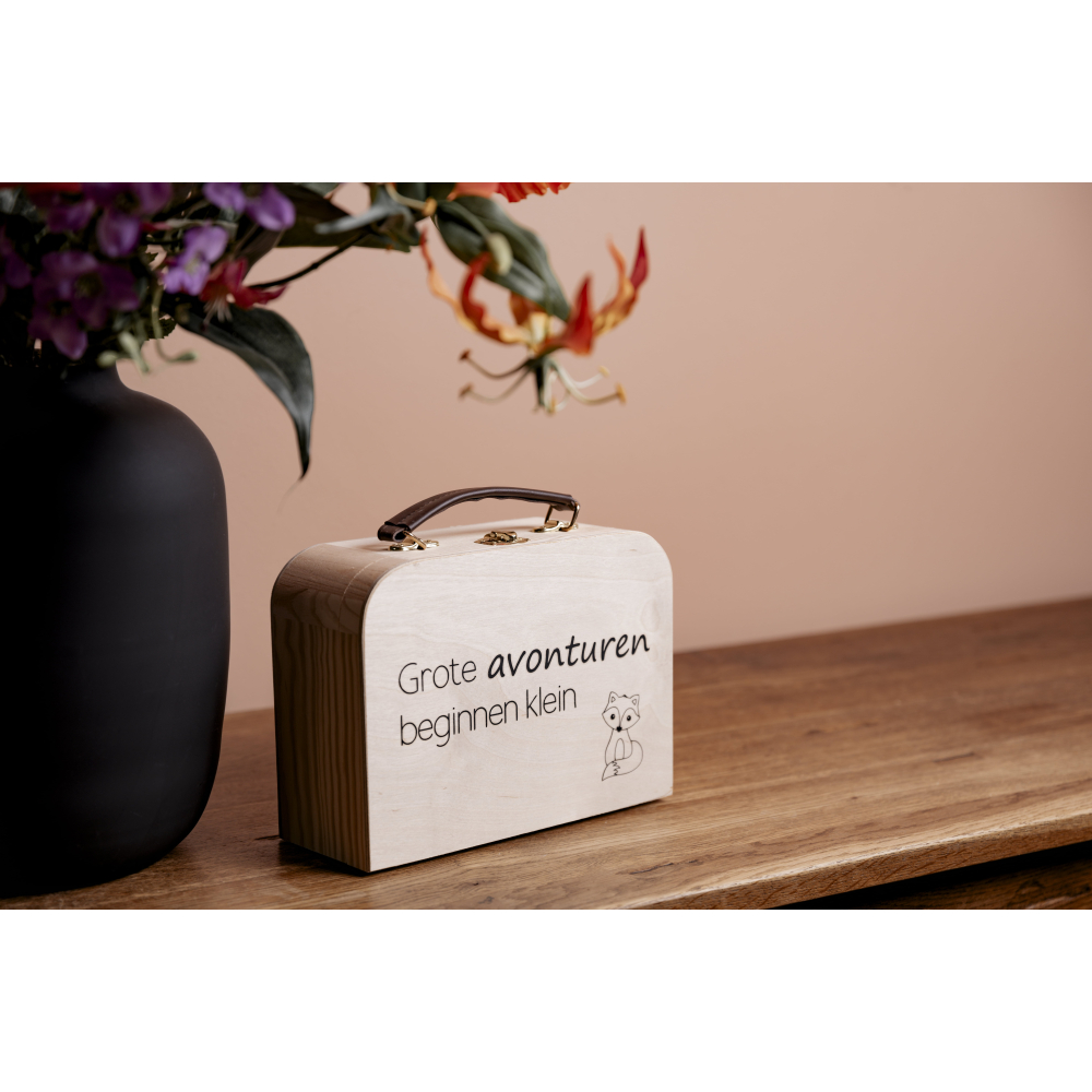 Dit schattige houten kinderkoffertje is het perfecte decoratieve accessoire voor elke kinderkamer. Met zijn natuurlijke houtkleur en speelse design voegt het een vleugje charme toe aan elke ruimte. Ideaal om te geven als kraamcadeau of voor een verjaardag, dit koffertje kan gebruikt worden om kleine schatten in te bewaren of simpelweg om de kamer te versieren. Een stijlvol en tijdloos geschenk dat zowel kinderen als ouders zullen waarderen!